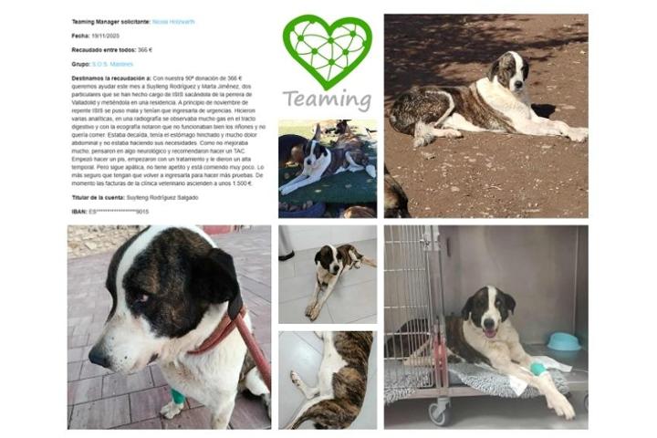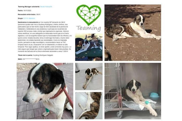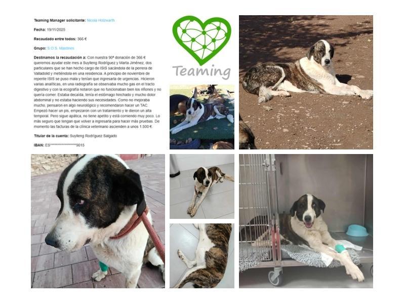 Querid@s teamers: con nuestra 90ª donación de 366 € queremos ayudar este mes a Suylleng Rodríguez y Marta Jiménez, dos particulares que se han hecho cargo de ISIS sacándola de la perrera de Valladolid (en perrera: CANDELA) y metiéndola en una residencia en Ciudad Real. Empezó el chequeo médico de ISIS con analíticas y todo iba bien: ISIS podía empezar una vida nueva. A principio de noviembre de repente ISIS se puso mala y tenían que ingresarla de urgencias. En un primero momento se pensó en una torsión de estómago, pero no fue así. Hicieron varias analíticas, en una radiografía se observaba mucho gas en el tracto digestivo y con la ecografía notaron que no funcionaban bien los riñones, no quería comer, tenía náuseas. Estaba decaída, tenía el estómago hinchado y mucho dolor abdominal y no estaba haciendo sus necesidades. Como no mejoraba mucho, pensaron en algo neurológico y recomendaron hacer un TAC. También se sospecha de una hernia y un pinzamiento en la columna vertebral, cosa que se va a ver en el TAC. Empezó hacer un pis, empezaron con un tratamiento y le dieron un alta temporal. Pero sigue apática, no tiene apetito y está comiendo muy poco. Tenían que volver a ingresarla, porque no remontaba, para hacer más pruebas y el TAC, lo que va a aumentar mucho los gastos veterinarios.