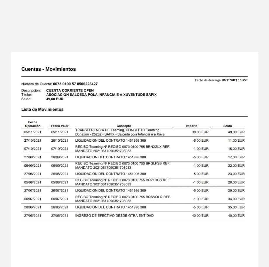 Como podéis ver en el extracto bancario, comenzamos con 40€ y se nos estaban terminando, por lo que decidimos "hacer una donación al proyecto" que es como lo llama Teaming. En nuestro caso es una donación a la cuenta de Sapix para poder seguir manteniéndola e ir teniendo algún € más al mes para ayuda de gastos, ya que somos 15 teamers.