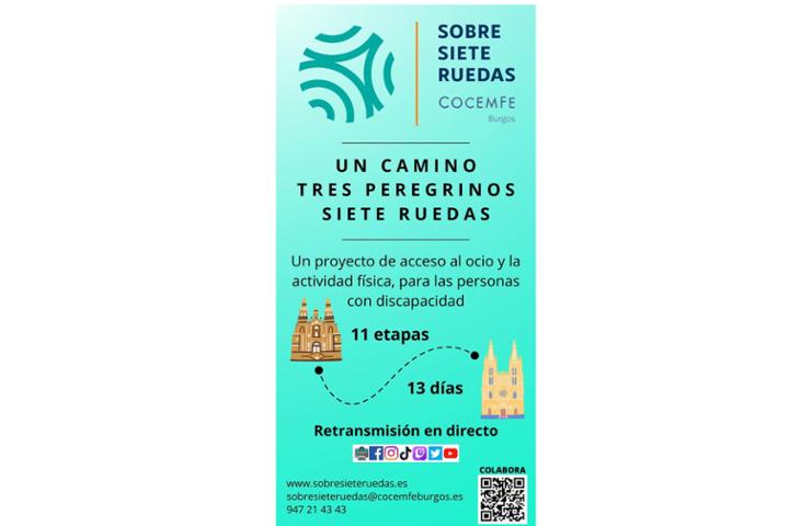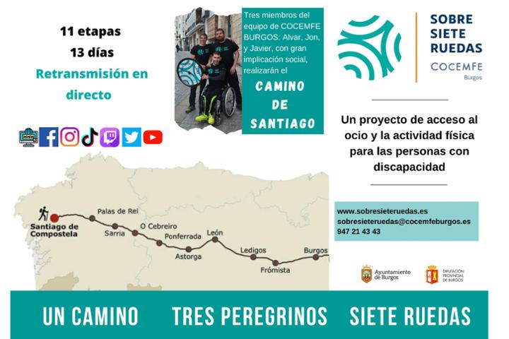 Con el objetivo dar visibilidad a la discapacidad y promocionar el servicio de“Ocio y Tiempo Libre”que desarrolla COCEMFE BURGOS,y recaudar los fondos necesarios para poder incrementar nuestra oferta de ocio,arranca el Proyecto“SOBRE SIETE RUEDAS” El proyecto consiste en la realización del Camino de Santiago partiendo desde la sede de Cocemfe Burgos hasta la Catedral de Santiago de Compostela,recorriendo+de500km por parte de 3 miembros del equipo técnico de la entidad,2de ellos,con discapacidad