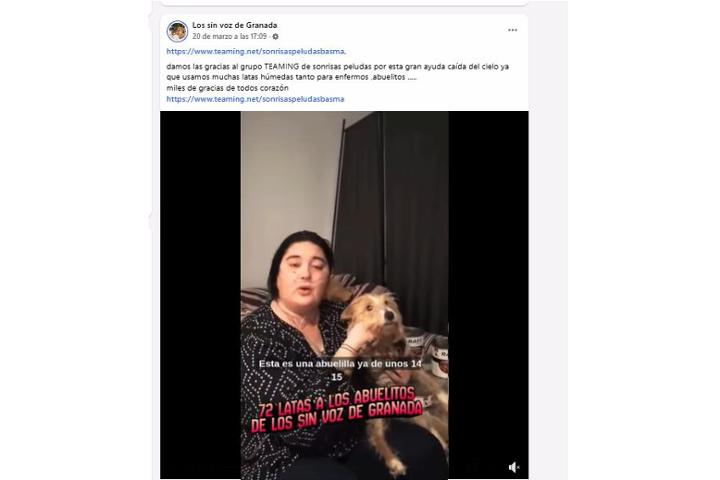 Desde el grupo Teaming **Sonrisas Peludas**, y en nombre de todas las personas que forman parte de esta gran familia, hemos enviado nuestro abrazo virtual y una donación de **72 latas de 800g de excelente calidad** ️
