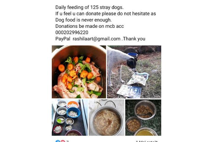 Schaut gerne bei Rashila Vigneshwari Ramchurn auf ihrer Facebook Seite "Street art for animal welfare" vorbei- sie selbst nennt sich dort "Ar Nou Non". Sie kümmert sich täglich um die Versorgung von über 100 Streunern, indem sie sie mit Reis, Hühnchen und Gemüse versorgt. In ihrer Freizeit kocht Rashila mehrere Stunden und fährt dann verschiedene Spots ab, um die hungrigen Tiere einmal täglich zu füttern. Helft mir, sie zu unterstützen, dass die Tiere nicht an Hunger sterben und notwendige Behandlungen und Sterilisationen erhalten können!