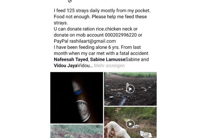 I collect donations for stray animals in Mauritius. With the group I want to support a friend of mine, Dr. Rashila Vigneshwari Ramchurn. She is a teacher in Mauritius and is one of the few private individuals that take care of stray animals there. This includes feeding, treating and neutering the countless animals that would have died long ago without her help. For over 10 years she has been providing the approximately 100 animals in her area daily with her own money, please help!