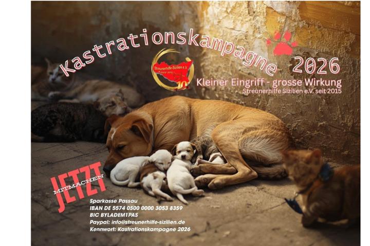 Fuer Infos kontaktiert unseren Verein via email: info@streunerhilfe-sizilien.de oder Wats up: Bianca 0039 333 6982 114 oder schreibt uns einfach eine Nachricht auf Facebook.