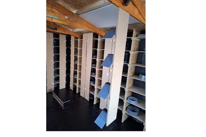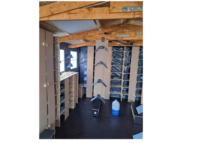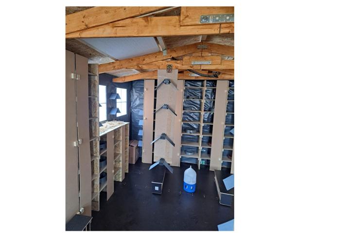 Die Bretter in den Nistzellen können herausgenommen werden zum reinigen und auch die Blenden können für die Reinigung weggeklappt werden.