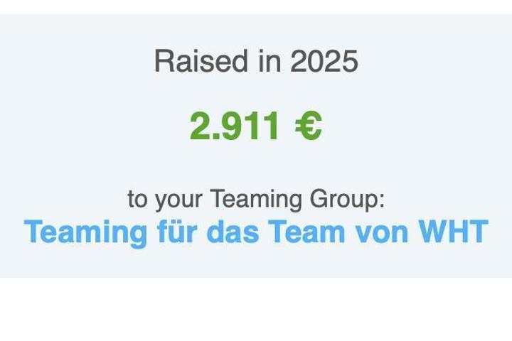Danke für Eure Unterstützung hier bei Teaming und das Geld, dass wir dadurch Monat für Monat sammeln können. Helft uns, dass die Gruppe wächst und ladet Freunde und Familie ein, uns mit monatlich 1€ zu unterstützen. Startet gut ins NEUE JAHR 2026 und bleibt gesund.