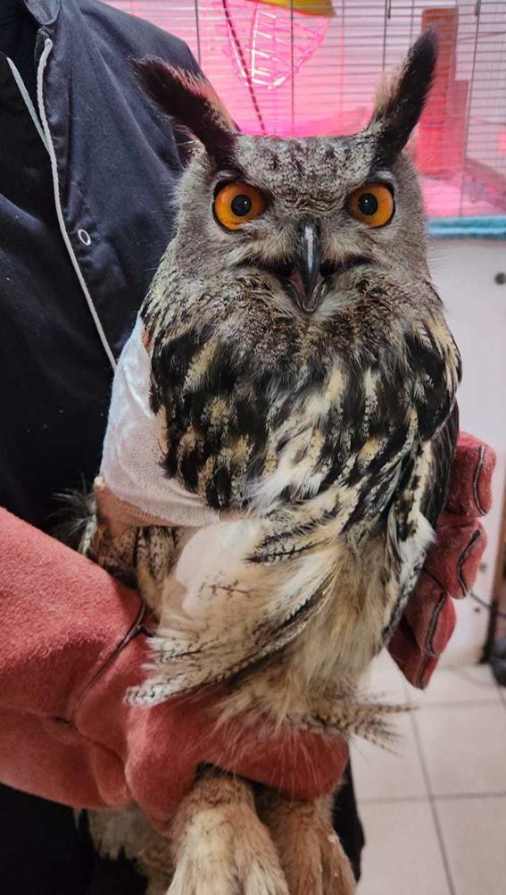 Retrouvé enchevêtré dans des ronces dans une propriété du Nord-Isère, ce Grand-Duc d'Europe a pu être acheminé rapidement jusqu'au Tichodrome grâce au relais de nos bénévoles rapatrieurs. Le diagnostic d'entrée montrait de nombreuses contusions et plaies de frottement ainsi qu'une forte