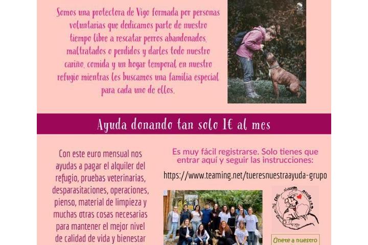 Somos una asociación en Vigo compuesta por pocos miembros que emplean el poco tiempo que disponen en ayudar, cuidar y solucionar casos de animales abandonados, maltratados...Conseguirles un hogar y mejorar su vida. Tenemos un refugio con un alquiler mensual, por ello pedimos ayuda para continuar desarrollando nuestra labor y seguir cuidando de ellos.Os animamos a que nos sigáis en las redes sociales, a que os involucreis en nuestra causa y que veáis que vuestro euro al mes, merece la pena.