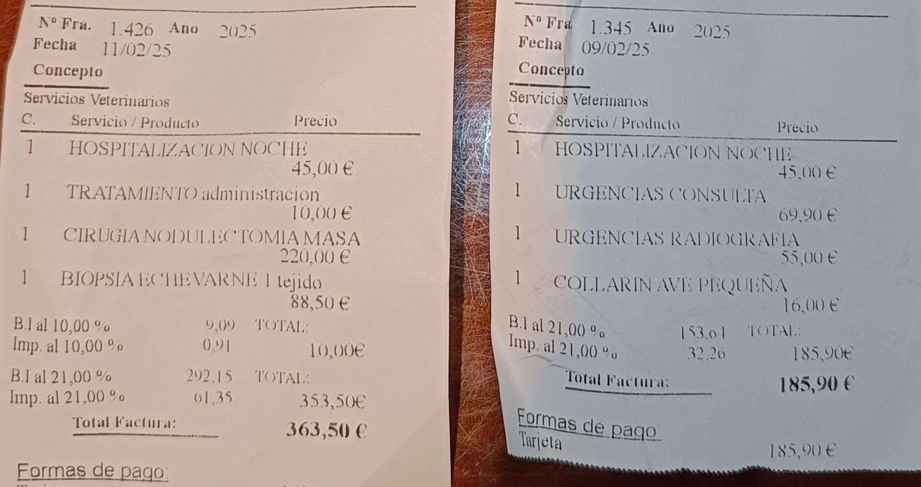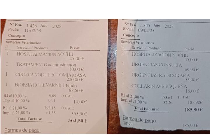 Primero Pichu (agapornis) tuvo que ser intervenido en febrero por un tumor en la glándula uropigial. Hubo que hacer analíticas a Coco y Kiwi (cotorras), además de los implantes. Pipo (hamster) se puso malito en febrero de la tripita y tuvo que quedarse ingresado. Ahora en abril, tuvimos que llevar a Pichu, porque tiene una fisura en una cadera y han tenido que intervenir a Pipo por un absceso en la boca que aún estamos tratando. Este mes, vamos realmente mal económicamente y Pipo aún sigue en tratamiento. En este mes van más de 500€ y un solo sueldo para todo.