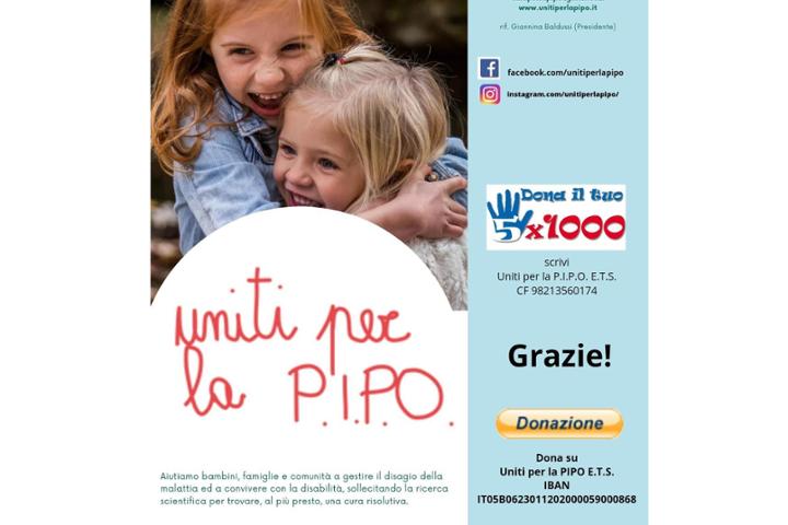 Uniti per la PIPO è un ETS creato per assistere i pazienti pediatrici affetti da pseudostruzione intestinale cronica (CIPO o POIC o PIPO) e le loro famiglie nel percorso fino alla diagnosi della patologia e dopo la diagnosi nell'assistenza al bambino malato sia medica che amministrativa e psicologica; l'Associazione si propone di promuovere la ricerca scientifica sulla patologia che è una malattia rara gravemente invalidante che al momento non ha cura;attualmente finanzia più progetti di ricerca