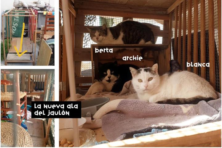 Por fin... desde domingo por la noche están reunidos los 3 gatos del aparcamiento. Disfrutan de la nueva ala del jaulón con silla y puf de fibra natural. Tienen vista a la colonia aunque que pueden esconderse cuando quieren. Son atendidos 2 a 3 veces por día y se van acostumbrando a los olores y ruidos del sitio, a las voces de sus cuidadores, a la rutina de la colonia.