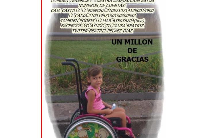 Me llamo Beatriz Pelaez Diaz nací el 15/10/2007 en Ciudad Real.Tengo Atrofia Muscular Espinal Tipo 3, afecta al sistema nervioso central y es una enfermedad en la que hay una progresiva degeneración muscular y debilidad, afectando a las moto-neuronas. Afecta al sistema respiratorio y los músculos se van atrofiando, se perde capacidad para andar, moverse, respirar. Esta pagina sera destinada a la cubrir mis gastos terapéuticos,y aparatos ,sillas de ruedas . ¡¡¡AYUDANOS!!!